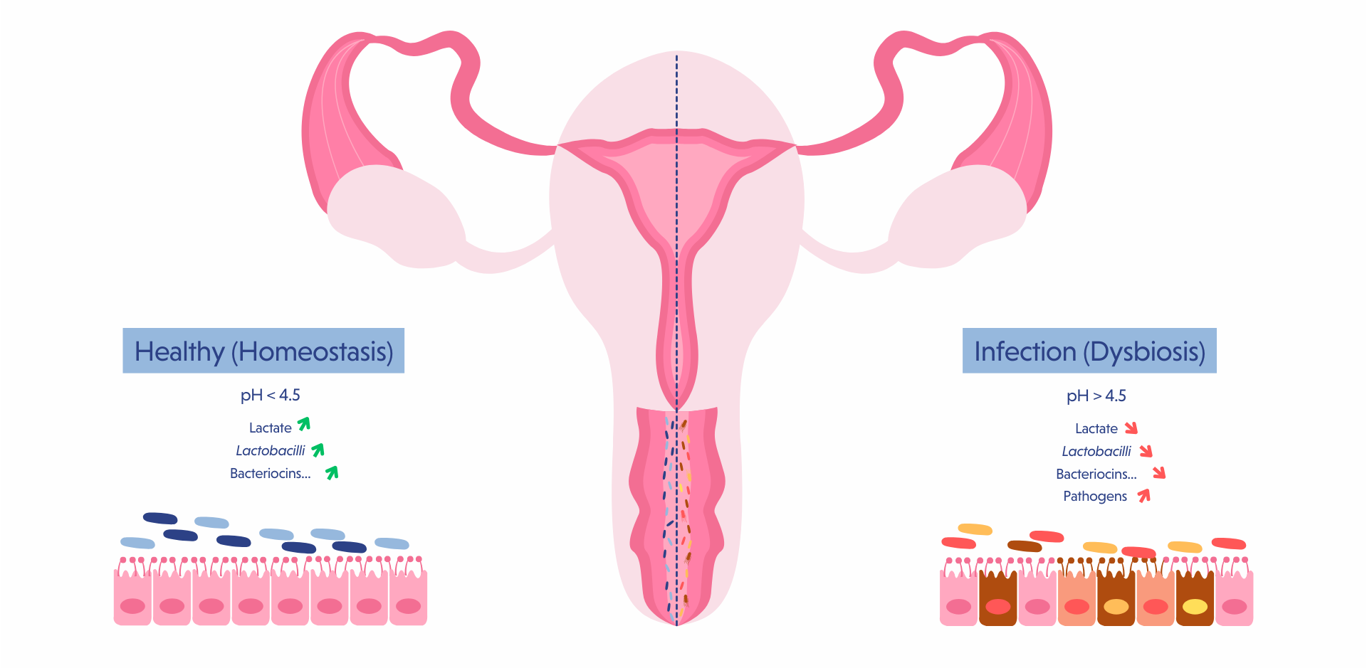 A healthy vaginal microbiota, associated with reduced risks of vaginal infections and pregnancy complications such as preterm birth, is characterized by a low-diversity, Lactobacilli-dominated ecosystem that produces anti-pathogen substances, maintains a protective and physiological acidic pH, and stimulates the immune system and mucus secretion (7).