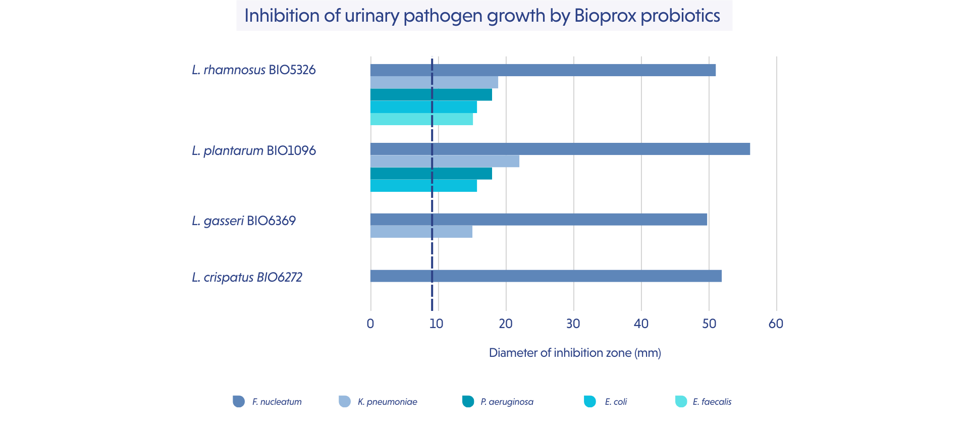 The Agar spot antimicrobial assays highlighted the ability of Bioprox strains to inhibit G. vaginalis as well as the 4 major urinary pathogens.