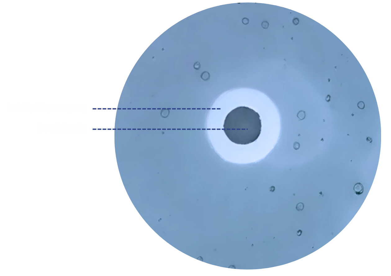 The assessment of pathogens’ inhibition by our probiotics were performed using the agar spot antimicrobial assay. Pathogens were poured over the agar plates containing a spot of probiotics, and the inhibition of pathogen growth was considered positive when a clear zone around the spot was wider than 9 mm.
